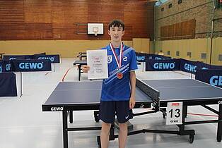 Auch in diesem Jahr landete unser Berliner Spieler in der offensichtlich schwierigeren Gruppe, mit den späteren Erst- und Drittplatzierten. Phillip startete gegen den Spieler aus Hessen und zeigte sich in richtig guter Form. Er konnte sogar 2:1 in Führung gehen. Satz 4 war dann hart umkämpft und ging leider in der Verlängerung an den Gegner. Im fünften Satz lief plötzlich nichts mehr richtig rund und das Spiel ging mit 2:3 nach Hessen. Danach musste Phillip gegen den späteren Turniergewinner aus Bayern ran. Dem schon erfahrenen Spieler mit einem TTR-Wert von über 1150 hatte er beim 0:3 nicht viel entgegenzusetzen, ließ sich aber mit 7:11, 7:11 und 5:11 auch nicht abkochen. Danach fand Phillip immer mehr in sein Spiel und holte gegen die Spieler aus der Pfalz und aus Schleswig-Holstein jeweils ein deutliches 3:0, bevor er in einem spannenden Spiel Mateo Raith aus Baden-Württemberg 3:2 schlagen konnte. Auf Platz 4 in der Gruppe, ging es am Abend glücklich zurück ins Hotel. Am Sonntagmorgen startete Phillip mit einem deutlichen 3:0 gegen den Hamburger, bevor das schwere Spiel, gegen den hoch bepunkteten David Brachmann aus Brandenburg auf dem Programm stand. Nach 11:4 und 11:3 wurde ein Satz zu 6 abgegeben. Aber Phillip blieb konzentriert und konnte den nächsten Satz 11:7 gewinnen. Zuletzt hieß es noch 3:0 gegen Arvid aus Sachsen-Anhalt, mit dem Phillip vor Ort ganz schnell Freundschaft geschlossen hatte. Mit diesen super Ergebnissen, schaffte Phillip es auf Platz 3 in der Gruppe und schrammte nur um einen Satz am Spiel um die Bronzemedaille vorbei.